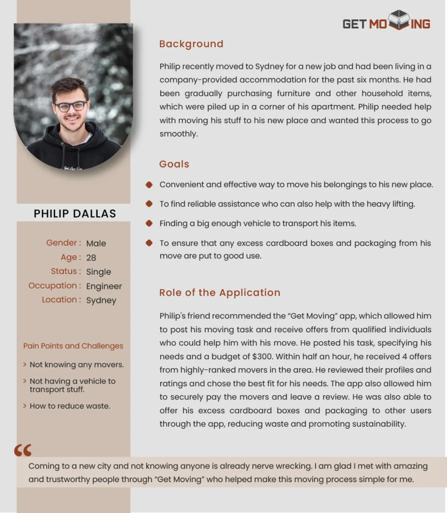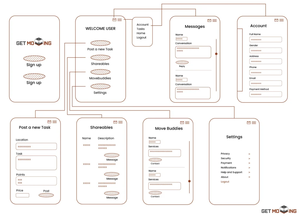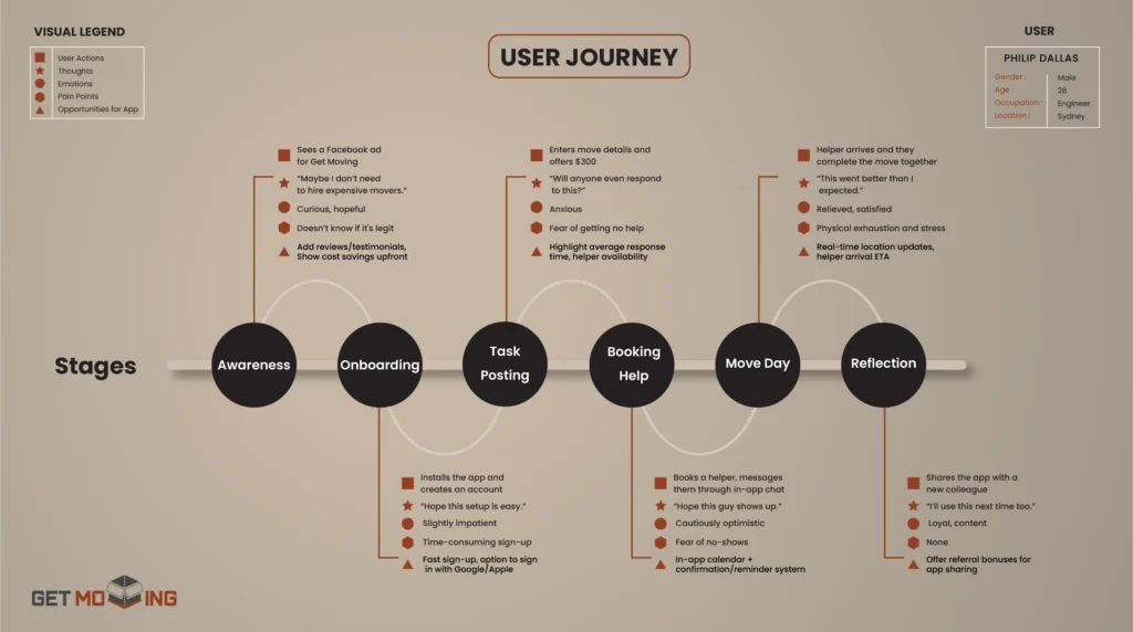 I designed a moving assistance app through a user-centered approach, starting with interviews and surveys to understand the real challenges people face during the moving process. Based on these insights, I developed user personas and mapped out user journeys to guide the overall experience. Wireframes were created to plan a clear and intuitive flow, which led to a final interface that’s both functional and visually cohesive. The goal was to design an experience that feels seamless, supportive, and easy to navigate from start to finish.